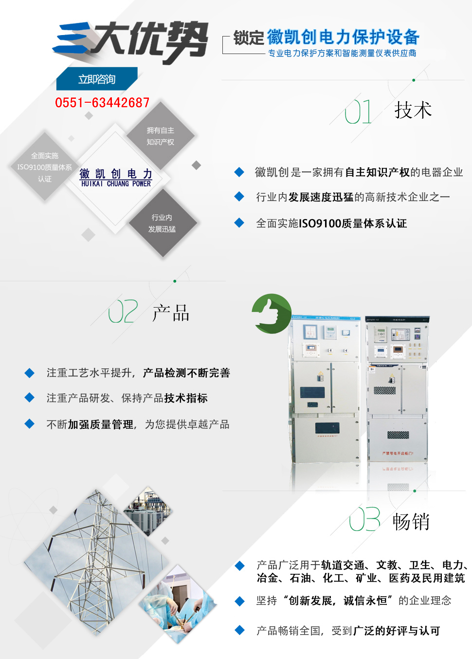 安徽徽凱創(chuàng)電力保護(hù)設(shè)備有限公司主要從事新型電氣設(shè)備、電子設(shè)備、智能控制技術(shù)的產(chǎn)品研發(fā)、生產(chǎn)、銷(xiāo)售。主要產(chǎn)品有:智能型消弧消諧裝置、消諧過(guò)電壓抑制柜、 組合式過(guò)電壓保護(hù)、智能型開(kāi)關(guān)柜智能操控裝置、微機(jī)消諧、小電流選線、電弧光保護(hù)裝置、智能在線絕緣監(jiān)測(cè)裝置等電氣產(chǎn)品。 產(chǎn)品廣泛用于石化、煤炭、電力、建筑、市政、機(jī)場(chǎng)、鐵路、醫(yī)院、學(xué)校等領(lǐng)域,受到用戶一致好評(píng)。