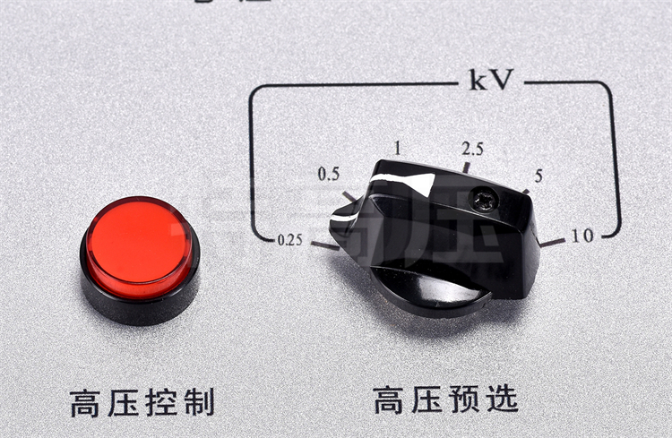 • 4、高壓輸出范圍寬廣:可選擇0.25kV、0.5kV、1kV、2.5kV、5kV、10kV,也可從0V平滑調節(jié)到需要的電壓。